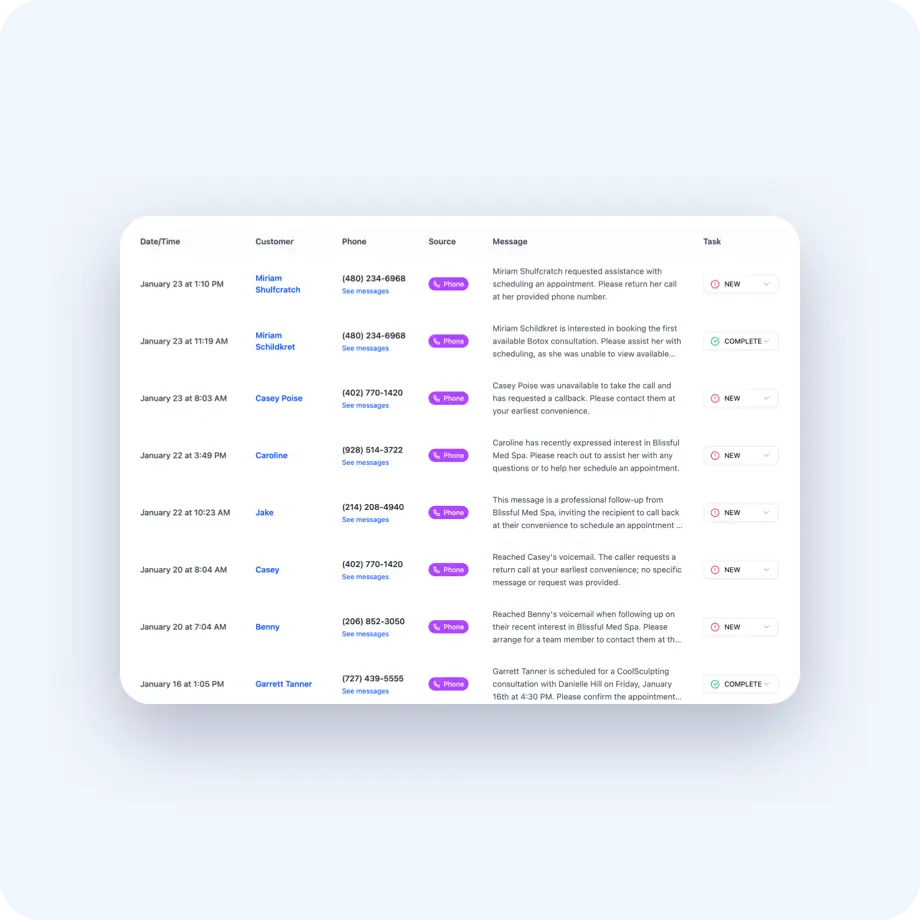Recura answers calls, texts back leads, and books consults, so your calendar fills even overnight.